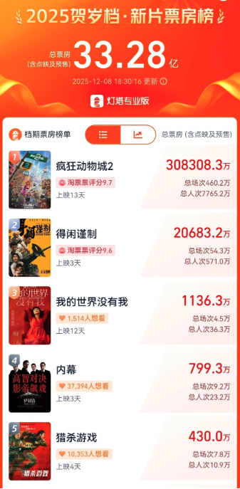 12月7日時点の興行収入(前売り含む)は30.51億人民元となり、すでに昨年の最終成績を突破しました。さらに12月8日18時30分には33.28億人民元に達し、この勢いのまま年末まで伸びることが予想されています。